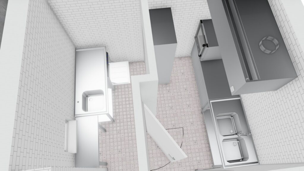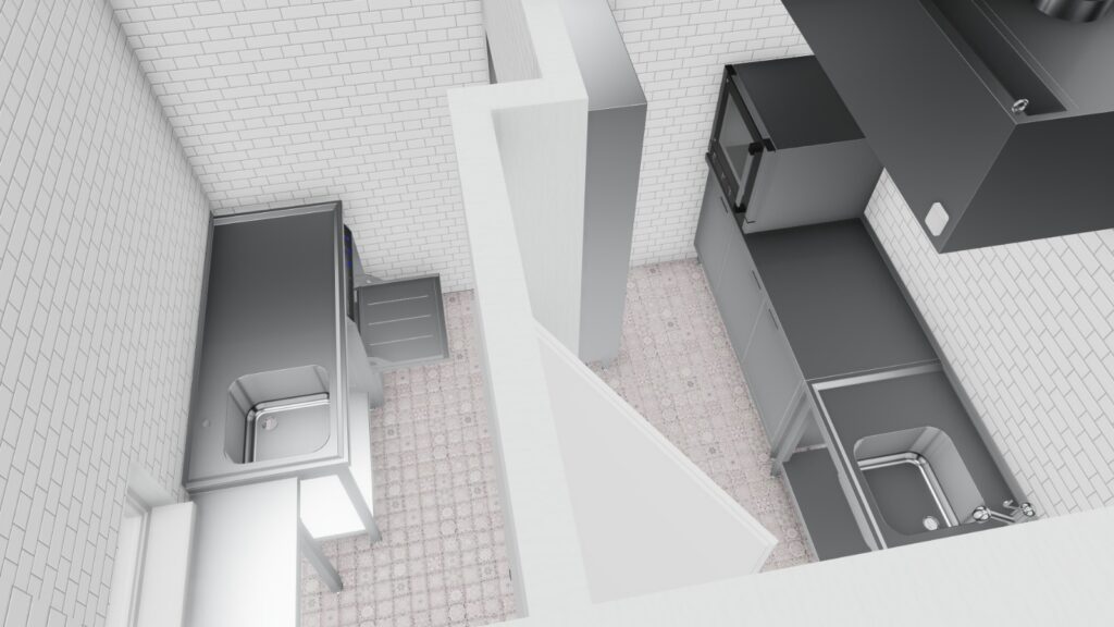 • Lokalizacja urządzeń: Urządzenia w kuchni barowej i zmywalni będą rozmieszczone zgodnie z zasadami ergonomii, umożliwiając swobodny dostęp do wszystkich elementów. Strefy robocze będą dostosowane do specyfiki pracy w barze, a procesy będą płynnie przechodziły z jednej strefy do drugiej.